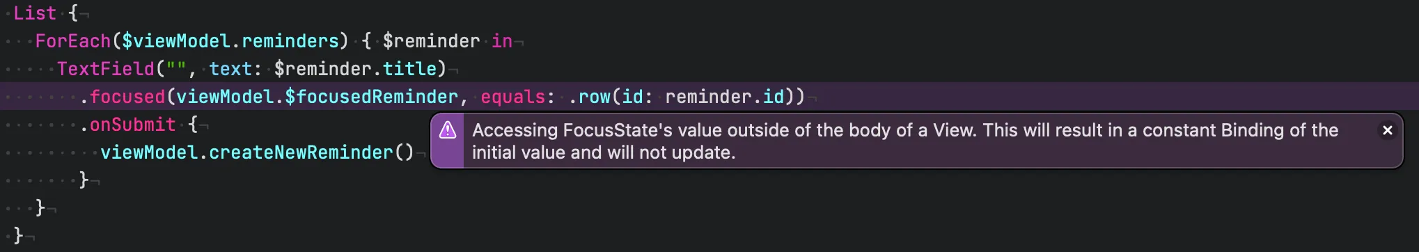 }This all looks great, but when running this code, you will notice the focus handling no longer works, and instead we receive a SwiftUI runtime warning that says Accessing FocusState’s value outside of the body of a View. This will result in a constant Binding of the initial value and will not update: